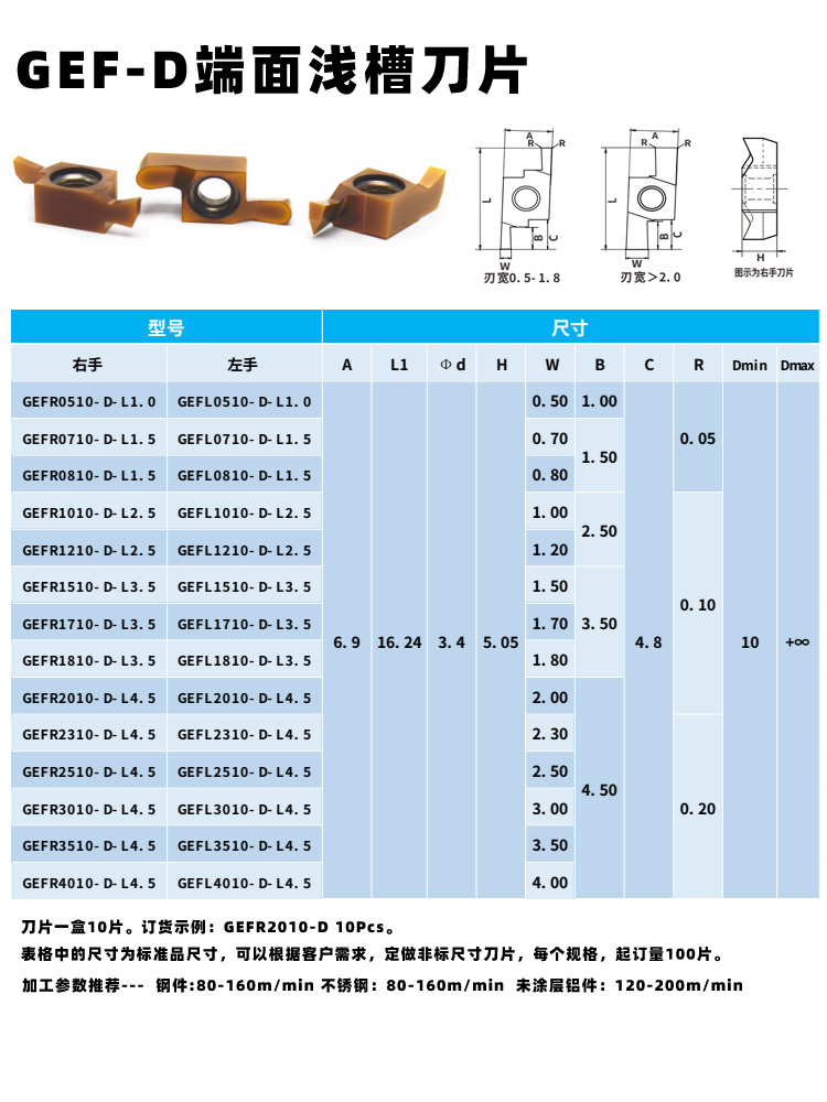 GEF端面槽刀片,GEF-D單邊Z大切深4.5MM,切槽范圍10mm往上無(wú)限制。端面環(huán)槽刀片槽寬可選0.50 0.70 0.80 1.00 1.20 1.50 1.70 1.80 2.00 2.30 2.50 3.00 3.50 4.00mm。端面圓弧槽刀片R角有,R0.50,R0.60 ,R0.75,R1.00,R1.25,R1.50,R1.75,R2.0。