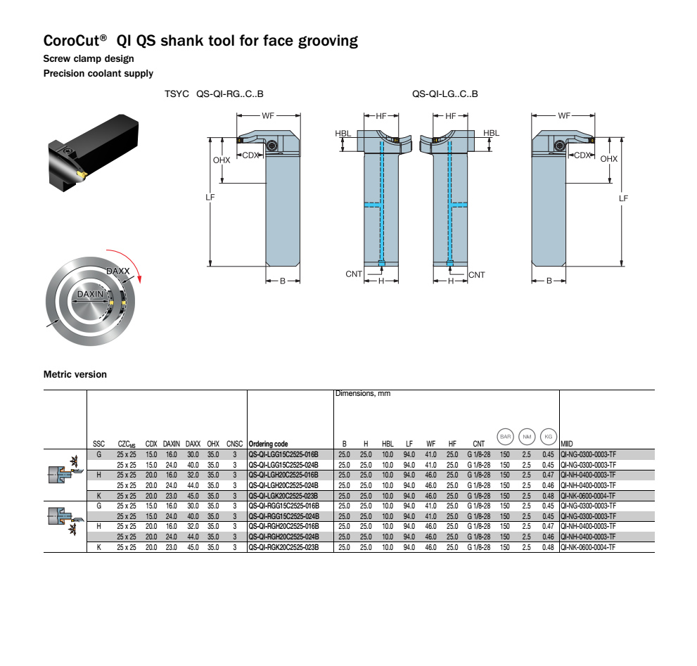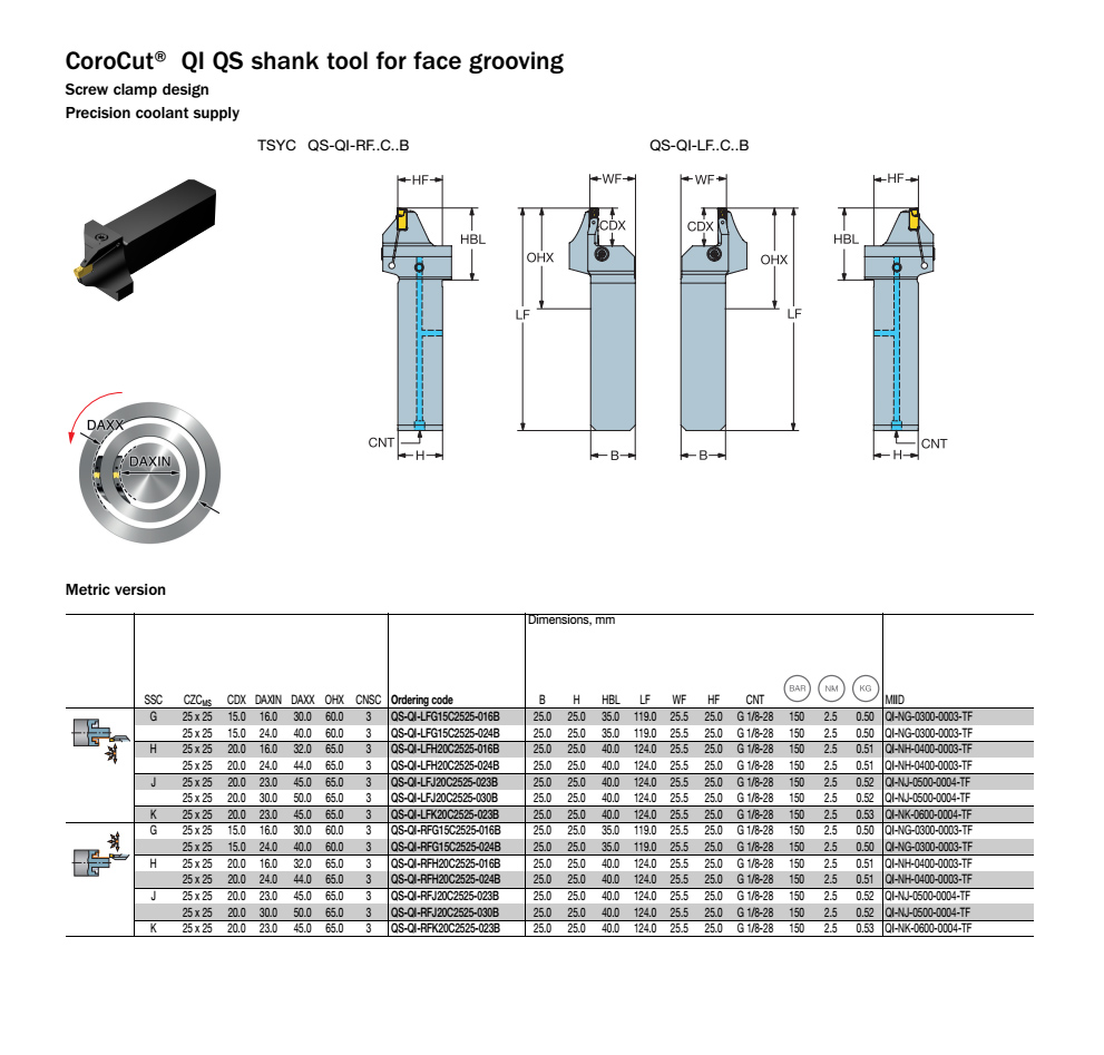 得益于QI切槽刀,在小直徑上進行切槽加工變得更可靠。由于配備導軌刀片座,該款刀具能夠確保刀片穩(wěn)定性,提供經(jīng)濟性高且穩(wěn)定的內(nèi)圓切槽和端面切槽加工。通過更輕快的切削加工以及配備高品質(zhì)切削刃的刀片,QI能夠保證高質(zhì)量的切槽表面。