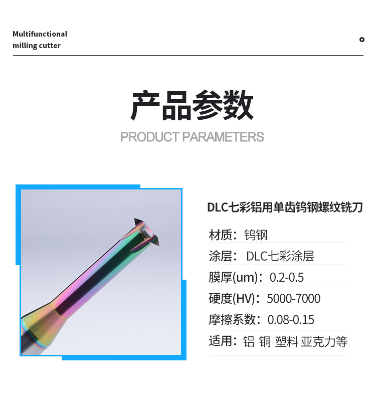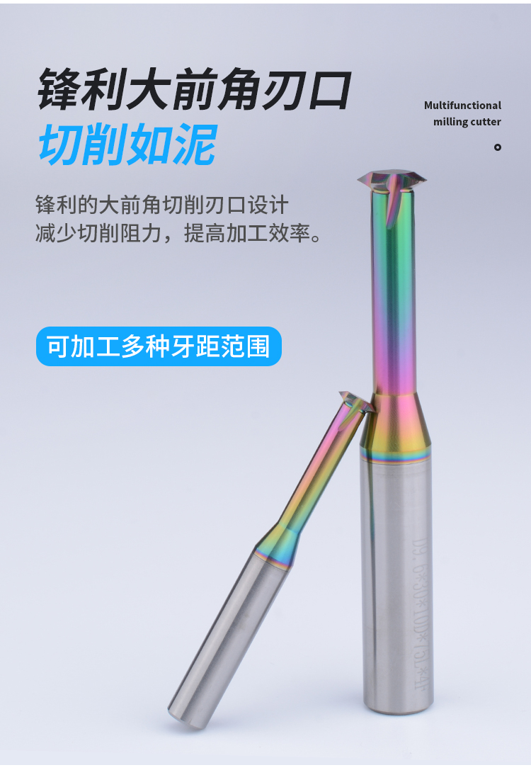 60度牙型角鋁專用單牙鎢鋼螺紋銑刀適合加工打樣件螺紋孔數(shù)量不多,螺紋規(guī)格多,使用方便,單扣牙加工抗力小,可加工較深的螺紋孔,七彩DLC涂層具有Z低的摩擦系數(shù),對非鐵金屬具有高抗熔結性,抗腐蝕性。