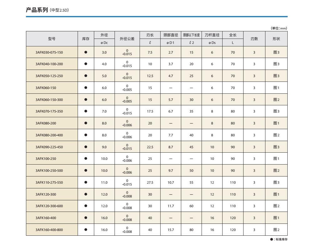 3AFK030-045-090直徑3mm刃長4.5mm頸部以下長度9mm總長70mm 端銑刀 3刃規(guī)格保證高效率。優(yōu)良的加工精度;抑制毛刺大前角與第一外圓刃后角保證優(yōu)良的鋒利度;大芯厚,高抗振刀性能;刃長2.5D(中號型)系列化,縱切深大時也能實現(xiàn)穩(wěn)定加工。