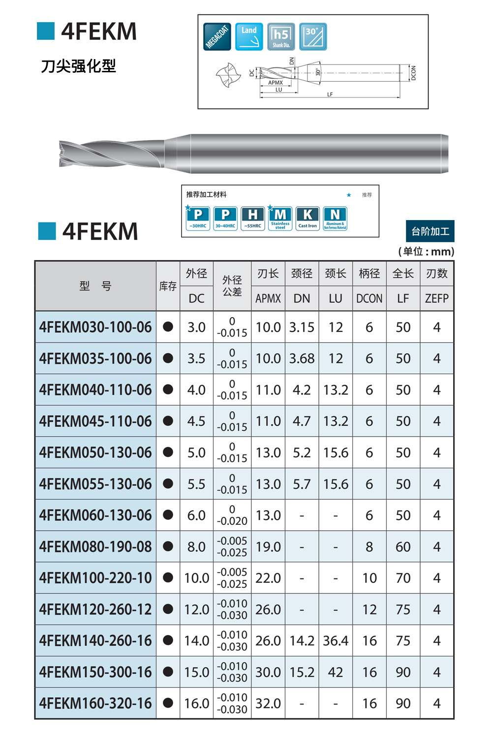 30度螺旋角刃尖強(qiáng)化型四刃立銑刀4FEKM系列,推薦加工HRC30鋼件、不銹鋼,也可加工HRC40鋼件、鑄鐵、鋁合金及HRC55度淬火鋼