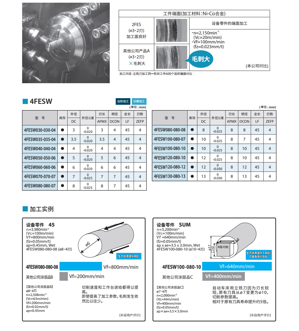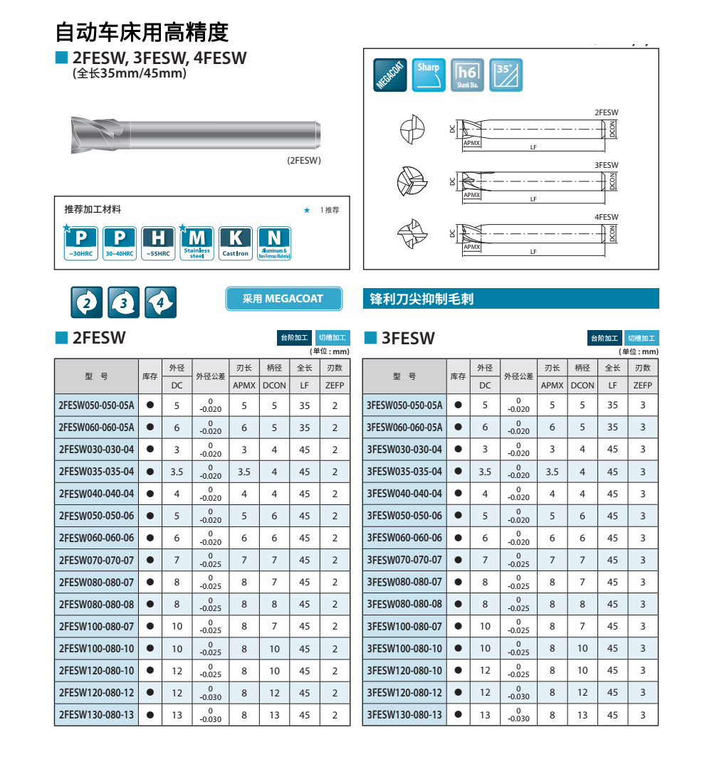 4刃自動(dòng)車床用涂層銑刀臺(tái)階加工,槽加工4FESW系列全長45mm,鋒利切削刃螺旋角35度,可加工HRC30-40鋼件、hrc55度淬火鋼、不銹鋼、鑄鐵、鋁合金。