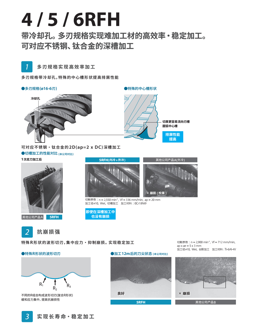 難削材加工用 高效率粗加工端銑刀 4/5/6RFH 帶冷卻孔、多刃規(guī)格,難削材的高效率加工。可對(duì)應(yīng)不銹鋼、鈦合金的深槽加工。 產(chǎn)品特點(diǎn) 帶冷卻孔、多刃規(guī)格,實(shí)現(xiàn)高效率加工 特殊R形狀的波形切刃,應(yīng)力集中、抑制崩損,實(shí)現(xiàn)穩(wěn)定加工,高硬度涂層實(shí)現(xiàn)長(zhǎng)壽命、穩(wěn)定加工 可對(duì)應(yīng)粗加工~半精加工,