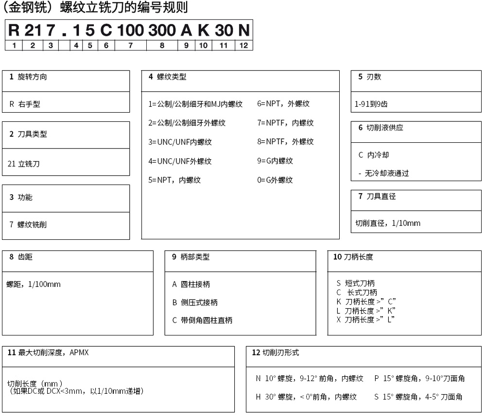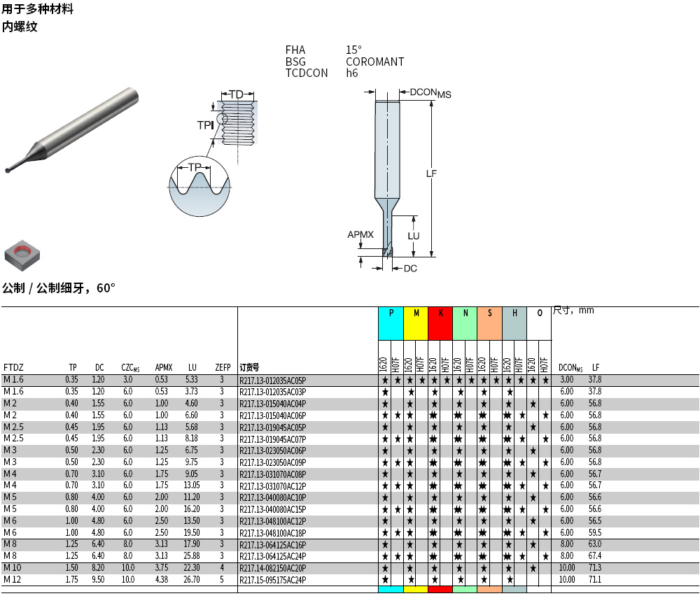公制整體式硬質(zhì)合金螺紋立銑刀R217.15-095175AC24P1620規(guī)格M12直徑9.5mm螺紋深度4.38mm