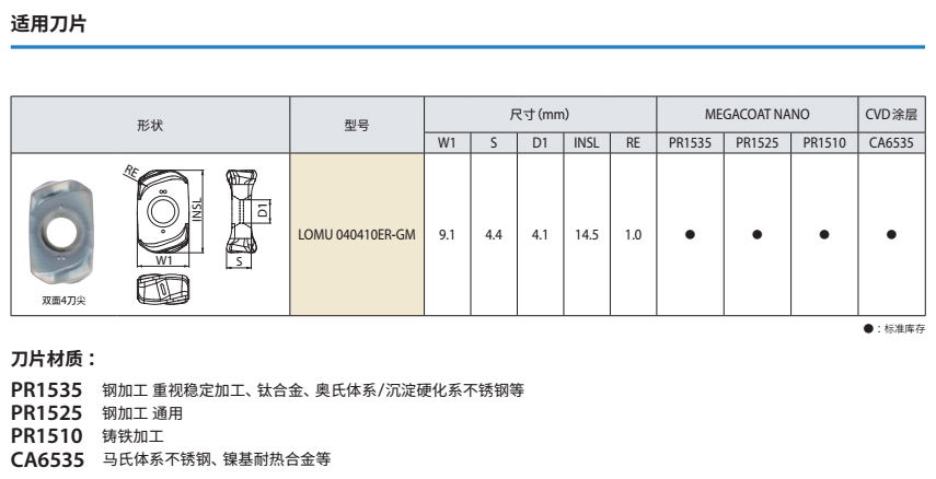 LOMU 040410ER-GM尺寸小型刀片(雙面 4刀尖規(guī)格)??蓪?duì)應(yīng)加工大縱切深 2.5mm,可實(shí)現(xiàn)臺(tái)階 槽加工、螺旋斜降加工等的高效 3維加工。鈦合金、奧氏體系/沉淀硬化系不銹鋼