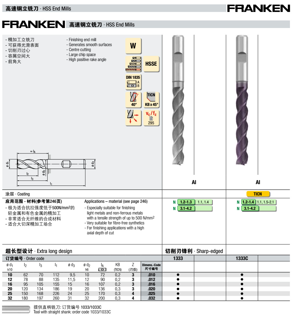 FRANKEN法蘭肯精加工立銑刀可獲得光滑表面切削刃過心,容屑空間大40度螺旋角前角大直徑范圍大