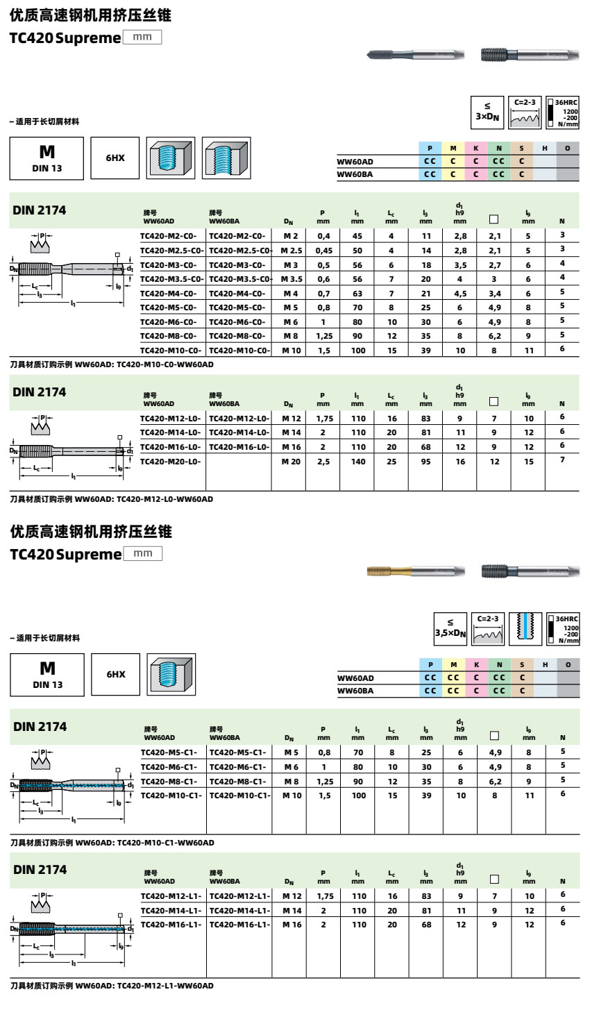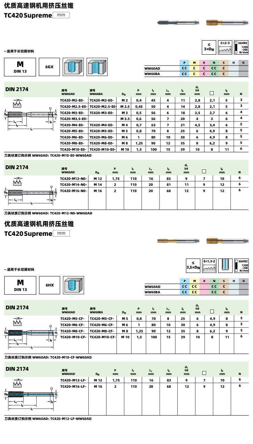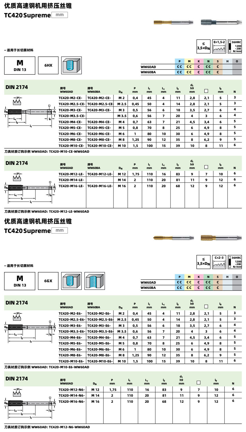 高速鋼機用擠壓絲錐 TC420 適合加工HRC36以下鋼件、不銹鋼、鋁合金、鑄鐵