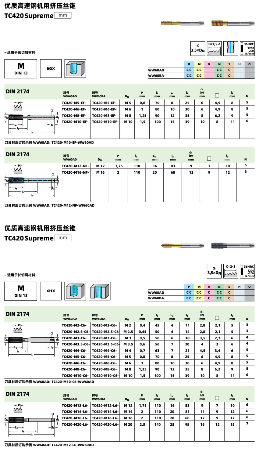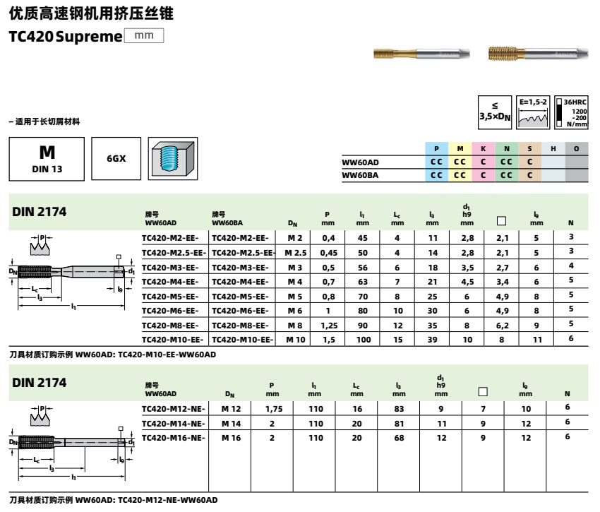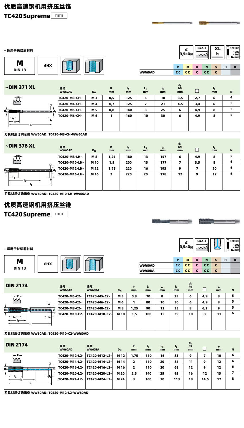 高速鋼機用擠壓絲錐 TC420 適合加工HRC36以下鋼件、不銹鋼、鋁合金、鑄鐵