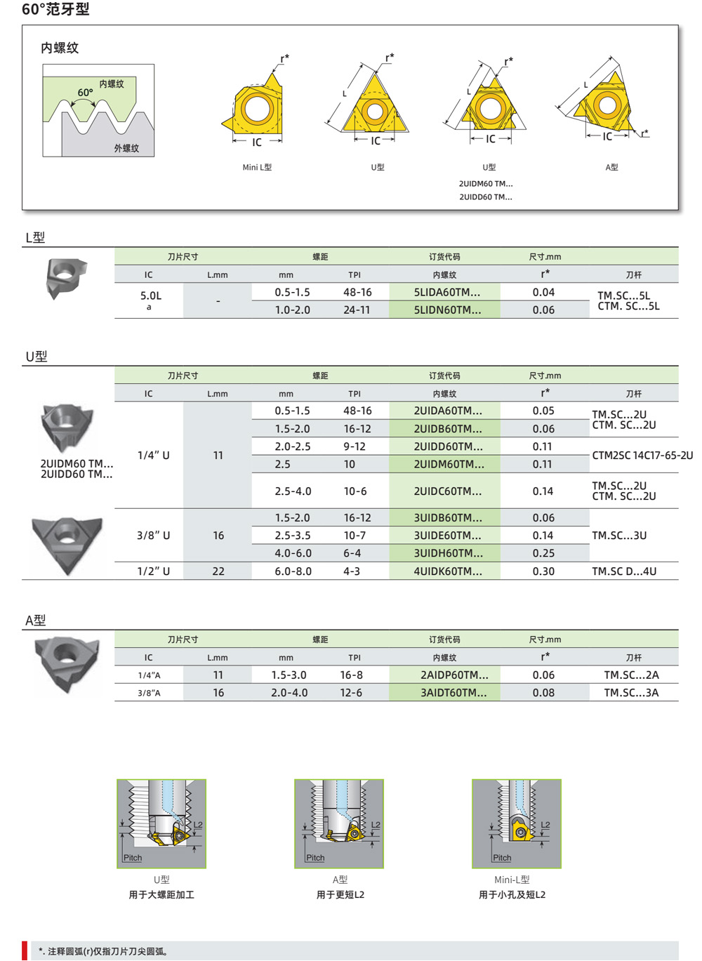 5LIDN60TMVTX 用于銑刀螺紋加工的 TMSD 刀片加工 1.0-2.0公制螺紋,24-11牙美制螺紋