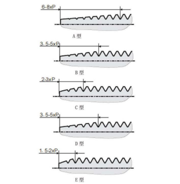 綜上所述,Z常用的切削錐為B型(通孔)和C型(盲孔),當盲孔螺紋收尾較短(<2.5個牙)時,應采用 E型短錐形。