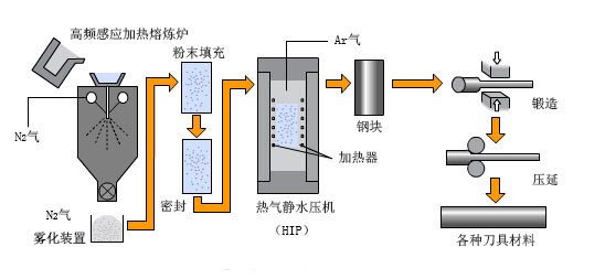 粉末高速鋼是將高速鋼粉末凝固制造而成的。制造方法是將高純度、高壓的氮?dú)獯等肴刍母咚黉撝行纬汕驙钗⒓?xì)粉末,然后將這種粉末填入軟鋼制的罐中,通過真空脫氣、密封后,在高溫高壓條件下沖壓形成鋼塊。因其原料狀態(tài)是微細(xì)粉末而被稱為粉末高速鋼。與之相對,一般的高速鋼稱為熔煉高速鋼。